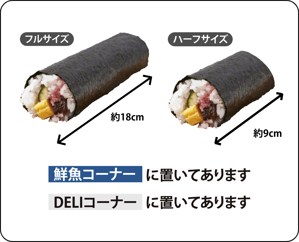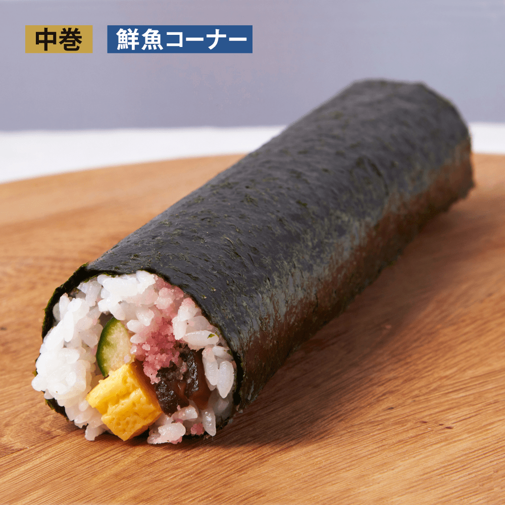 生本まぐろ大トロ、天然寒ブリ、いくら、イカ、海老、だし巻き玉子、きゅうり、大葉と、特撰素材を贅沢にたっぷり巻込みました