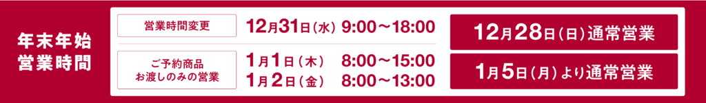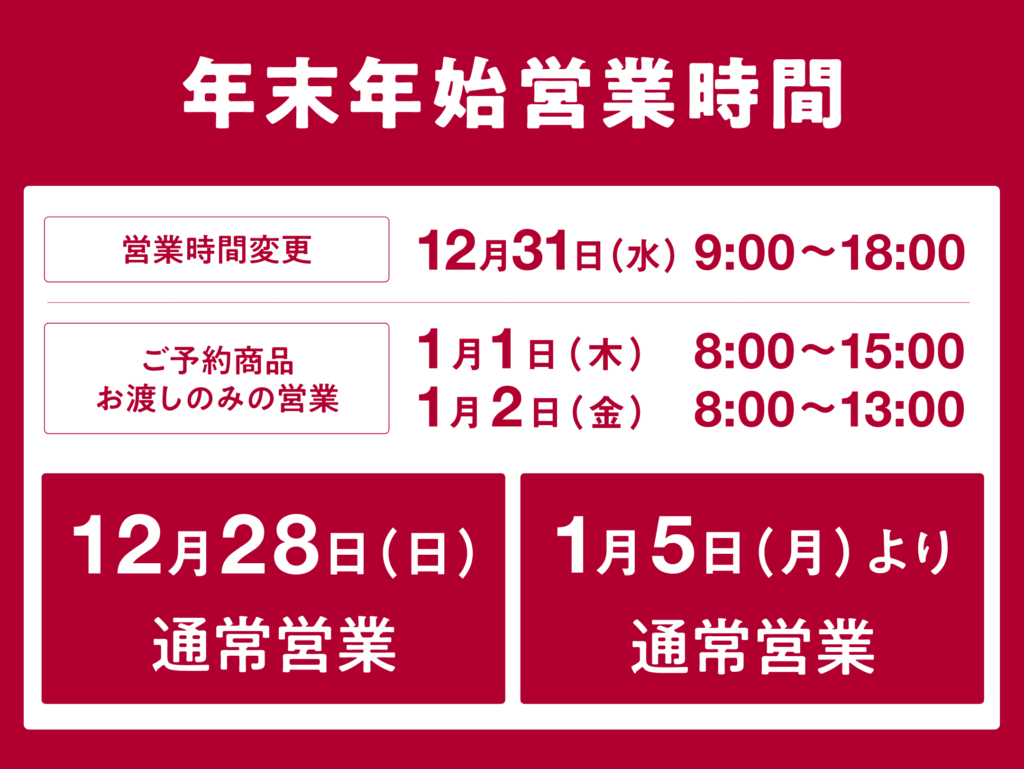年末年始 営業時間変更および休業日のお知らせ 投稿日 2025年12月17日 著者 fantas カテゴリー 営業時間・休業日お知らせ 年末年始 営業時間変更および休業日のお知らせ 日頃よりご利用いただき誠にありがとございます。ファンタスマーケットでは、年末年始 営業時間変更および休業日を以下の通りとさせていただきます。 ご不便をお掛けいたしますが、何卒ご了承くださいますようお願い申し上げます。 この記事を書いた人 fantas 記事一覧 ウェブサイト